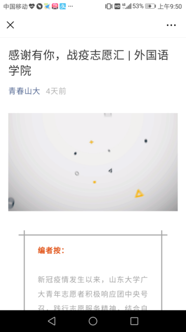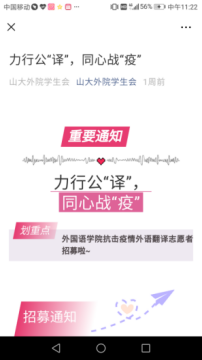 “公译战疫”平台充分立足山东大学“为天下储人才,为国家图富强”的办学宗旨,发挥开云(中国)官方网站登录界面的特色,以外语技能为基,充分发挥外院的学科优势,实现了专业特长与志愿服务的高度融合统一,双向促进,推动公益助人与个人成长的完美契合。公译平台以外语类志愿为主要方向,精准满足疫情期间外语翻译需求,汇集大量的志愿者,在体现鲜明的外语人才特色的同时弘扬山大办学特色、彰显山大青年品格,助力抗疫行动。平台预计在疫情结束后将作为常设公益平台,为社会各界继续提供公益性翻译服务。
